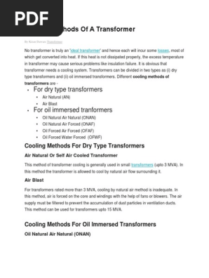 This is the simplest cooling method. These fans are provided with automatic switching. For transformers rated more than 3 mva, cooling by natural air method is inadequate. This increases the cooling of transformer tank to five to six time its natural means. Many transformers have a natural air rating and a forced air rating. The tank is made hollow, and the air is blown to cool the transformer. Heat dissipation can be improved by applying forced air on the transformer surface fans are mounted near the radiator and are a utomatic controlled (some times not automatic), the fans produce f orced air on the transformer body and radiator to provide faster heat dissipation than natural flow of the air. In this the heat generated by windings and core is transferred to oil. And the air is passed through this heat exchanger by turning on the fan. The cooling methods of dry type transformer are divided into natural air cooling (an) and forced air cooling (af). Thus a heat exchanger is fitted in which hot oil is pumped out. This increases the cooling of transformer tank to five to six time its natural means. Indeed, these coolers reduce the temperature of the dielectric oil contained in the transformers thanks to the river water or a nearby lake.